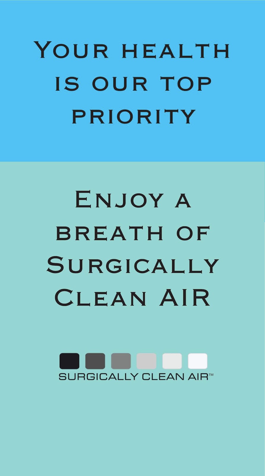 We are excited to announce that we have purchased two Jade Surgically Clean Air units that provide 6 stages of air filtration including: Hepa-Rx particulate filter, Carbon, Germicidal UV-C+, Hydroxyl Radical Reactivity Chamber, and a Revitalizing Negative Ion Chamber.